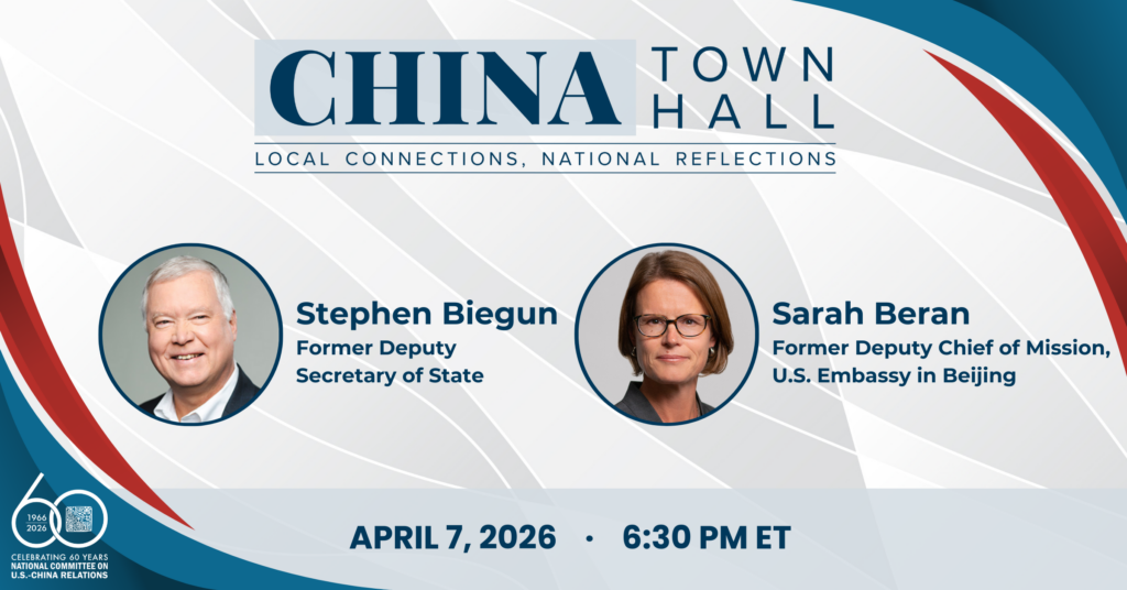 The 2026 CHINA Town Hall program will take place Tuesday, April 7, at 6:30 p.m. ET/3:30 p.m. PT, with two veteran senior diplomats discussing the current state and future trajectory of the U.S.-China relationship: Stephen Biegun, former U.S. deputy secretary of state, and Sarah Beran, former deputy chief of mission at the U.S. Embassy in Beijing and former senior director for China and Taiwan affairs at the White House National Security Council.